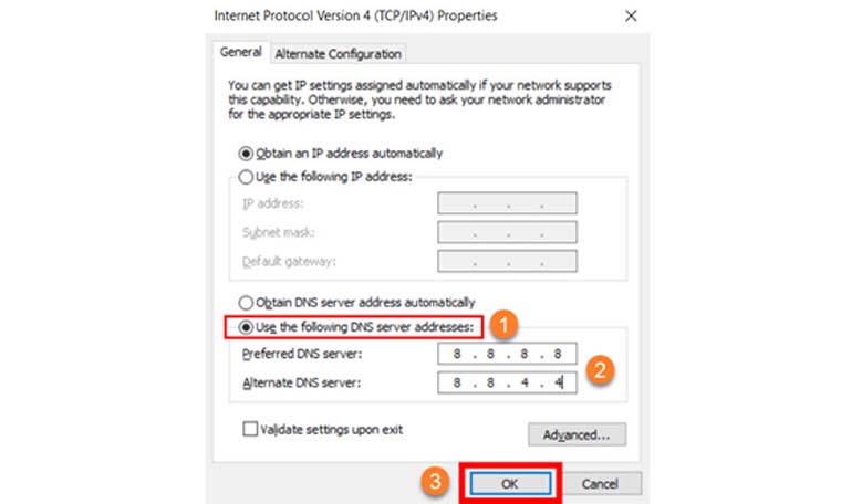 - گزینه Use the following DNS server addresses را فعال کرده و DNSهای مورد نظر را وارد کنید.