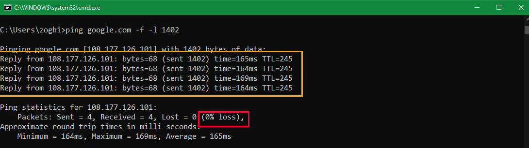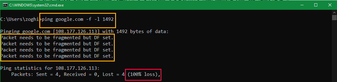 برای پیدا کردن مقدار صحیح، عدد 1492 را کم کرده و دوباره دستور را اجرا کنید. این کار را ادامه دهید تا پاسخی موفق (Reply) دریافت کنید و بستهها بدون تکهتکه شدن به مقصد برسند. سپس، میتوانید عدد بهدستآمده را یک واحد به یک واحد افزایش دهید تا بیشترین اندازه قابل تحمل را پیدا کنید.